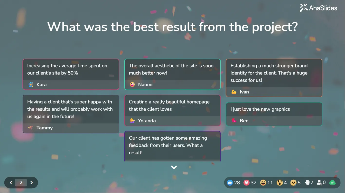 Make it interactive: Ask "What went well?" and "What should we improve?" via anonymous written submissions. Responses appear grouped by topic—no scrolling through chat trying to remember who said what.