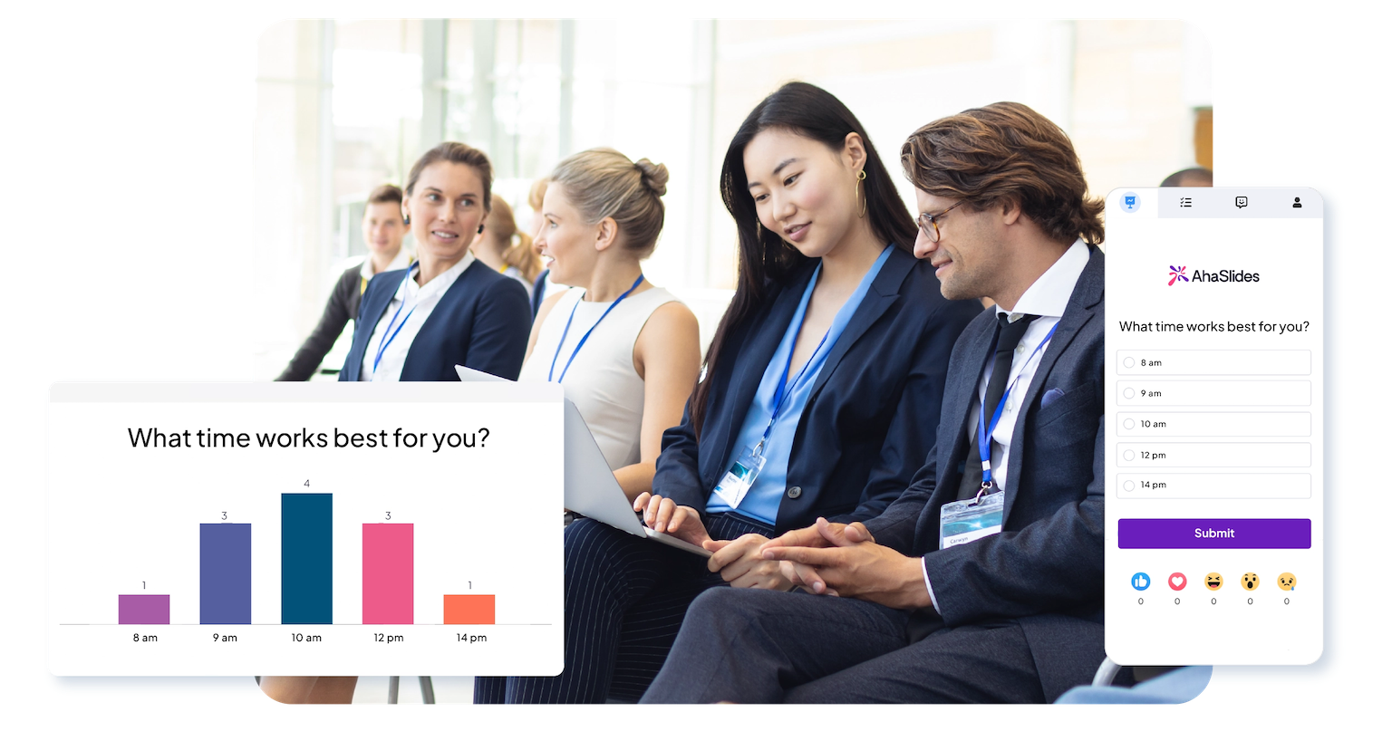 AhaSlides funcționează în toate formatele. Pentru sesiunile virtuale, participanții se alătură de pe dispozitive, indiferent de locație. Pentru sesiunile hibride, atât participanții din sală, cât și cei de la distanță interacționează în mod egal prin intermediul telefoanelor sau laptopurilor lor - nimeni nu este exclus.
